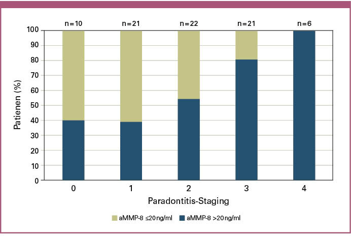 Der aMMP-8-Point-of-Care-Test kann für ein zeitnahes quantitatives Screening von Patienten eingesetzt werden [Sorsa 2016, Umeizudike 2022, Herr 2007, Nwhator 2014, Sorsa 1990, Sorsa 2020]. In einer aktuellen Untersuchung in Deutschland wurden 80 gesunde Probanden, davon viele ohne Anzeichen oder mit nur sehr geringen Symptomen einer Parodontalerkrankung (Stadien 0, 1 und 2 nach der internationalen Klassifikation [Tonetti 2018]), zusätzlich auf erhöhte aMMP-8-Werte in der Mundhöhle untersucht. Ein erheblicher Anteil von 40 % im Stadium 0, 38 % im Stadium 1 und 55 % im Stadium 2 hatte einen aktiven, fortschreitenden destruktiven Parodontitisprozess, der nur durch den Biomarker angezeigt wurde (siehe Abbildung 3; Pfützner Science & Health Institute, Data on file). Zur wirksamen Vorbeugung schwerer COVID-19-Erkrankungen wird daher empfohlen, auch scheinbar gesunde Personen auf das Vorliegen einer parodontalen Entzündung zu untersuchen.