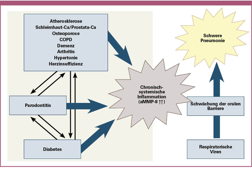 Der pathophysiologische Zusammenhang zwischen Mundgesundheit und Lungenerkrankung ist in Abbildung 1 schematisch dargestellt.