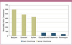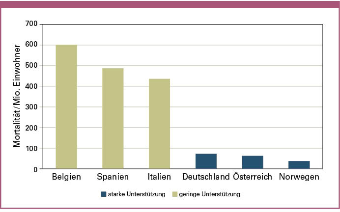 Patienten mit einer vorbestehenden Zahnfleischerkrankung, die häufig mit einer oralen Entzündung und einer damit verbundenen Verminderung der Schutzfunktion der Schleimhaut einhergeht, haben also zusätzlich zu den anderen zu erwartenden systemischen Komplikationen wahrscheinlich ein erhöhtes Risiko für eine COVID-19-Infektion mit schwerem Verlauf. Aktuelle bevölkerungsbezogene Analysen von schweren COVID-19-Verläufen in China [Sun 2020] zeigen hinsichtlich der Altersverteilung deutliche Parallelen zur steigenden Prävalenz von Parodontitis in vergleichbaren Studien, z. B. in den USA [Thornton 2013]. Solche Hochrisikopatienten mit geschädigter Mundschleimhaut sind sich ihres erhöhten Risikos meist nicht bewusst, da die oralen Symptome der chronischen Entzündung oft subklinisch sind. Ein weiterer Hinweis findet sich in den COVID-19-Mortalitätsstatistiken zu Beginn der Pandemie. Europäische Länder ohne regelmäßige und staatlich geförderte Mundhygienesprechstunden und -behandlungen (wie Belgien, Italien und Spanien) wiesen in den Anfangsphasen der Pandemie deutlich höhere Sterberaten auf als Länder mit besser etablierten Mundhygieneprogrammen, aber ansonsten vergleichbarer Infrastruktur und vergleichbarem Lebensstandard (wie Deutschland, Österreich oder Norwegen, Abb. 2) [Mealey 2007].