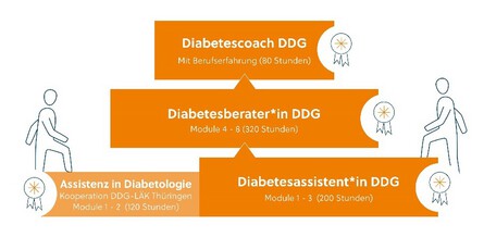 Die Verzahnung der Weiterbildungsangebote von LÄK Thüringen und DDG führt dazu, dass Kursteilnehmende der Weiterbildungsstätte Thüringen auf einen Schlag zwei Qualifizierungen erwerben können: den berufsrechtlich anerkannten Abschluss der Assistenz in der Diabetologie LÄK und darauf aufbauend den Abschluss Diabetesassistentin bzw. Diabetesassistent DDG.