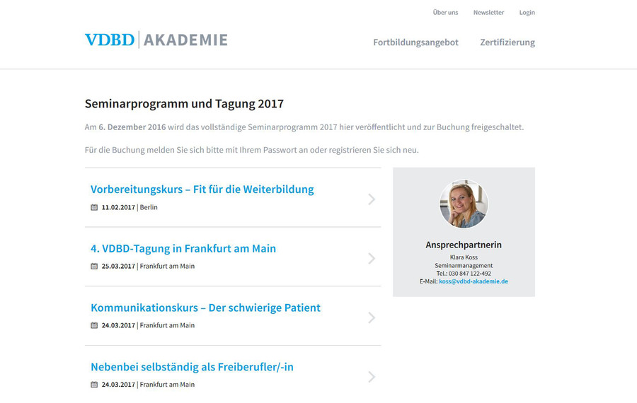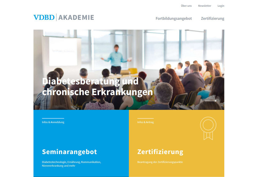 Im neuen Angebot finden sich auch Fortbildungskurse aus dem Bereich Pädagogik und Kommunikation mit den spannenden Titeln "Erlebnispädagogik" sowie "Der schwierige Patient". Und für Aspiranten der Weiterbildung zur Diabetesberaterin und Diabetesassistentenin gibt es erstmals einen Vorbereitungskurs "Fit für die Weiterbildung", der gemeinsam mit den Weiterbildungsstätten der DDG entwickelt wurde. Auch am Vortag der VDBD-Tagung wird es wieder Seminarangebote geben. Ein Blick auf die neue Website lohnt sich also auf jeden Fall.
