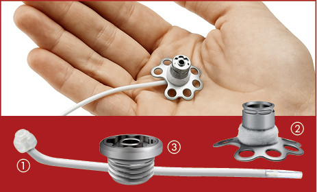 Der Katheter ① (s. Abb. 3) besteht aus einem gewebeverträglichen, weichen Material und führt vom Portkörper ② einige Zentimeter subkutan, um dann in das Peritoneum abzutauchen. Der Portkörper wiederum hält den Katheter am Platz und verbindet diesen mit der Hautoberfläche über eine Membran ③. Implantiert wird das System in einer ca. 30-minütigen Operation unter Vollnarkose. Bei dieser Operation wird über einen ca. 4 cm langen Hautschnitt eine Tasche geformt, in die der Portkörper implantiert wird.