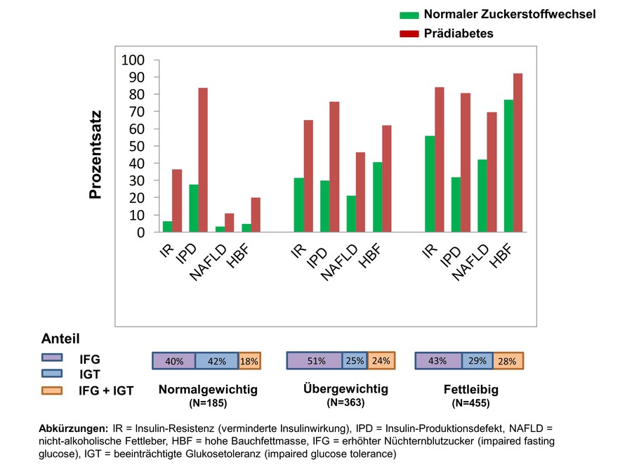 Basierend auf dem zunehmenden Wissen über das Vorliegen der verschiedenen Phänotypen des Stoffwechsels, die den stoffwechselgesunden fettleibigen Menschen und den stoffwechselkranken normalgewichtigen Menschen charakterisieren, haben die Wissenschaftler die Häufigkeit der vier Risiko-Phänotypen unter den unterschiedlichen BMI-Kategorien (Normalgewicht, Übergewicht, Fettleibigkeit) bei Menschen mit normalen Blutzuckerwerten und bei Menschen mit Prädiabetes untersucht. Sie konnten zeigen, dass zwischen den BMI-Kategorien eine unterschiedliche Verteilung dieser Phänotypen vorliegt (Abbildung). Während z.B. ein Insulinproduktionsdefekt der mit Abstand häufigste Risiko-Phänotyp bei normalgewichtigen Menschen mit Prädiabetes ist, nehmen die Häufigkeiten der Fettleber und des vermehrten Bauchfettgehalts bei übergewichtigen und adipösen Menschen deutlich zu.