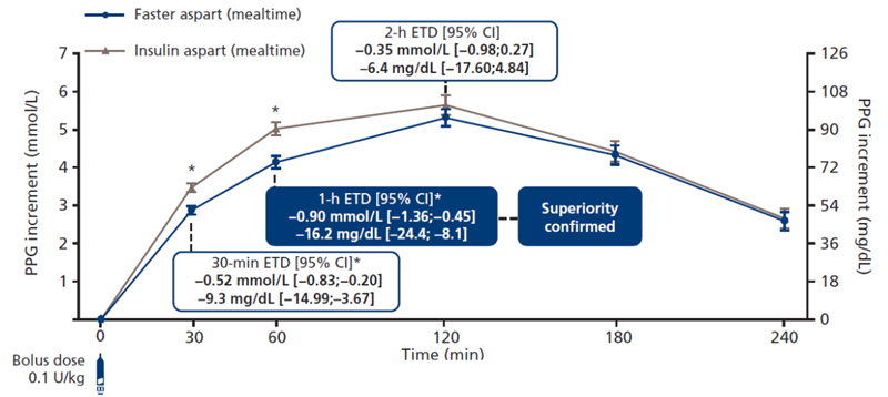 [1] Buse J, Carlson A, Komatsu M, et al. Efficacy and Safety of Faster Aspart Compared with Insulin Aspart both with Insulin Degludec in Adults with T1D. ADA-congress 2018; 1.000-P