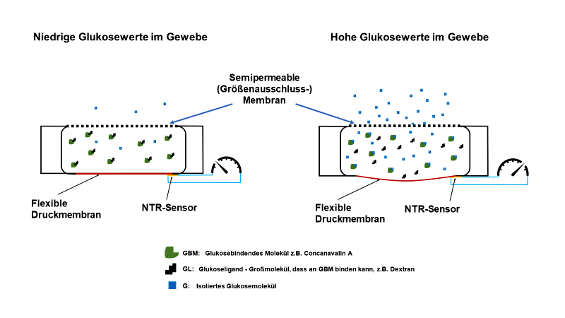 Für die Glukosemessung wird eine osmotische Druckkammer benötigt, die durch eine semipermeable Membran mit kleinsten Poren (Durchmesser ca. 5 nm) von der interstitiellen Flüssigkeit getrennt ist. Im Inneren der Kammer befindet sich ein großes glukosebindendes Molekül (GBM) mit speziellen Glukosebindungsstellen und ein Makromolekül, das stellvertretend für die Glukose an die Bindungsstellen andocken kann (glukoseähnlicher Ligand, GL). GBM und GL werden jeweils durch ihre Größe daran gehindert, die Druckkammer zu verlassen. Glukose hingegen kann als kleines Molekül problemlos durch die semipermeable Membran in die Kammer ein- und aus der Kammer austreten. Wenn keine Glukose vorhanden ist, verbinden sich GBM und GL durch elektrostatische Wechselwirkungen zu einem Komplex, der eine Osmolarität von 1 aufweist (1 osmotisch aktives Teilchen). Sobald Glukose in die Kammer diffundiert, verdrängt sie den GL aus der Bindung, da sie eine etwas höhere Bindungsaffinität zum GBM aufweist. Hierdurch werden beide Großmoleküle GBM und GL getrennt für sich osmotisch aktiv (2 osmotisch aktive Teilchen). Diese stoßen sich jetzt elektrostatisch ab. Da sie nicht aus der Kammer austreten können, steigt der osmotische Druck im Inneren an. Auch die Bindung der Glukose an das GBM ist reversibel und das System ist bindungsdynamisch so austariert, dass ein Absinken der Glukosekonzentrationen im Interstitium dazu führt, dass die Glukose die GBM-Bindung verlässt und durch die semipermeable Membran die Kammer verlässt. Hierdurch können sich GBM und GL wieder verbinden und der osmotische Druck nimmt ab. Da das System ausschließlich mit vollständig reversiblen Affinitätsbindungen arbeitet und somit kein Molekül zum Generieren des Messsignals beschädigt wird, ist theoretisch eine unendliche Lebensdauer dieser Messtechnologie wahrscheinlich [Johannessen 2010, Pfützner 2023].