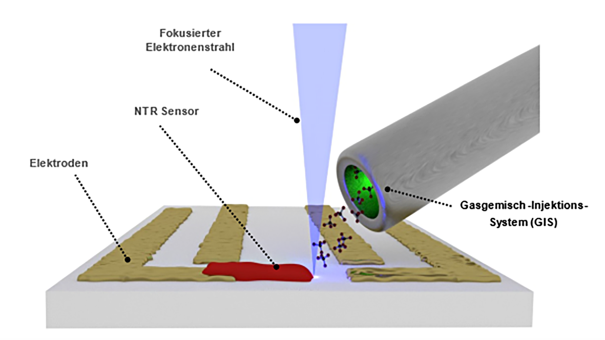 Bei entsprechender Auswahl der gasförmigen organometallischen Verbindungen entsteht z. B. ein Kohlenstoffband, in das metallische Granulome eingebunden sind [Huth 2021]. Die finale Größe und auch die dreidimensionale räumliche Struktur der entstehenden NTR-Sensoren kann durch eine entsprechende Software-Steuerung genau an die vorhandenen Notwendigkeiten angepasst werden.