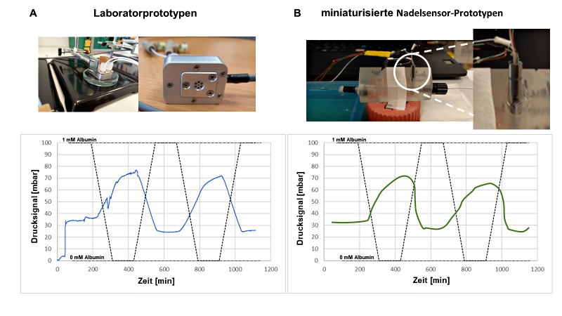 Abb. 5: Druckänderungen im Inneren der Osmosekammern bei Exposition der osmotischen Sensoren (nach Füllung mit 1 mM Albuminlösung) mit destilliertem Wasser bzw. 1 mM Albumin. A: Ergebnisse mit den Laborprototypen unter Verwendung piezoresistiver Druckwandler; B: Ergebnisse mit der miniaturisierten Kernsensoreinheit unter Verwendung von NTR-Sensoren.