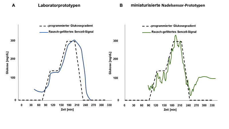 Die Ergebnisse der miniaturisierten Sensoren (Abb. 5b) zeigen, dass das Signal-Rausch-Verhältnis proportional zur Größe der Druckmembran schwächer wird, was zu einer ausgeprägteren Variabilität der Stromanzeige führt. Die erhöhten Signale bei einer (unphysiologischen) Glukosekonzentration von 0 mg/dl zu Beginn (A) bzw. am Ende (B) der Experimente sind Artefakte, die durch den verwendeten Standard-Glättungsfilter verursacht werden, der über Frequenzen wirkt (Butterworth-Filter). Ein optimierter Algorithmus zur Beseitigung solcher Artefakte wird entwickelt, sobald klinische Ergebnisse an Menschen verfügbar sind.