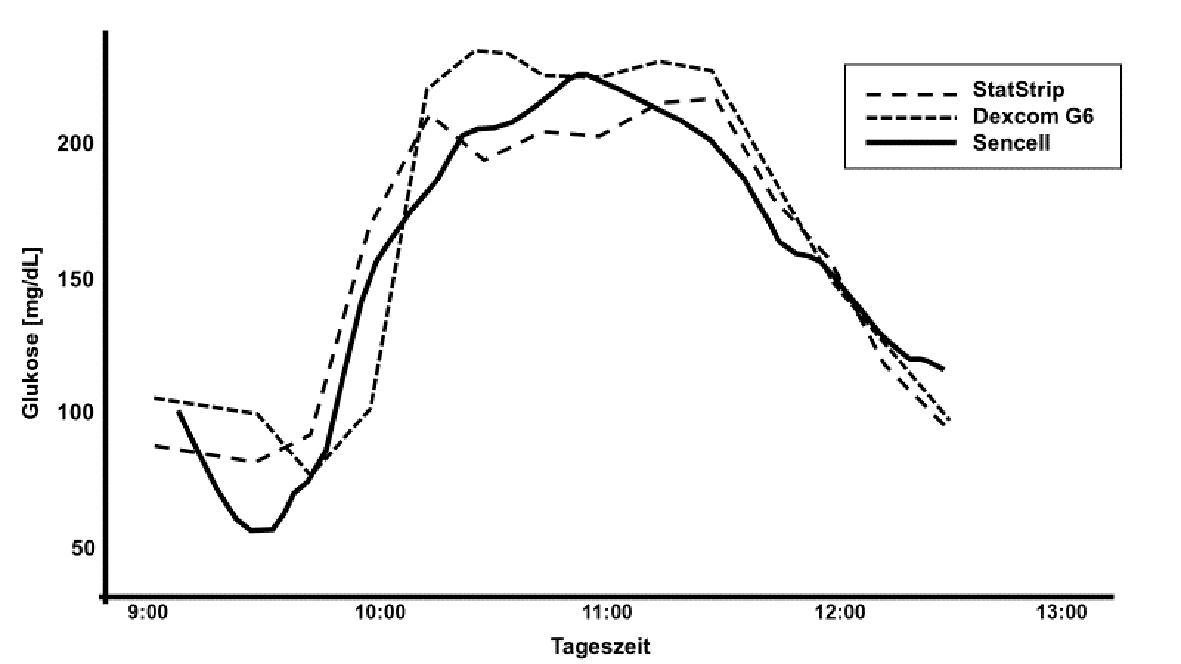 In einem klinischen Pilotversuch konnten (mit Zustimmung der zuständigen Ethikkommission und der Behörden) erstmals Sensorprotoypen, die – noch verkabelt – in eine Trokarnadel eingebettet waren, bei Probanden mit und ohne Diabetes getestet werden. Ziel dieser ersten Versuche war es, klinische Daten für die weitere Entwicklung des Auswertungs-Algorithmus zu erhalten. Bereits bei der initialen retrospektiven Analyse mit bioinformatischen Standardverfahren und im Vergleich mit einer teststreifenbasierten Referenzmethode (StatStrip) und einem kommerziell erhältlichen CGM-Sensor (Dexcom G6) zeigten sich sehr gute Übereinstimmungen bei den unterschiedlichen Messmethoden. Ein Beispiel von einem Mahlzeitenexperiment zeigt Abbildung 7.