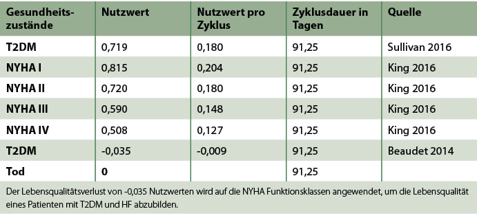 Die Nutzwerte der NYHA-Klassen wurden aus der Publikation von King (2016) entnommen, welche aus der CARE-HF (Cardiac Resynchronization in Heart Failure)-Studie stammen und auf Basis des EQ-5D-Fragebogens generiert wurden [Blomström 2008].