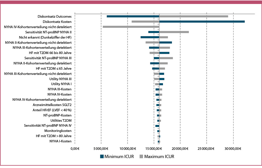 Als Limitation der Analyse muss berücksichtigt werden, dass die Übergangswahrscheinlichkeiten auf Basis von NYHA-Klassen nicht für unterschiedliche Risikoprofile von HF-Kohorten zur Verfügung stehen. Daher war es notwendig, eine Anpassung nach Risikostratifizierung (T2DM und HF sowie erkannt und nicht erkannt) mithilfe der Mortalitätsraten vorzunehmen. Der Ansatz wurde bereits in der ökonomischen Analyse von van Giessen (2016) beschrieben und umgesetzt. Die herangezogenen Sensitivitätswerte von NT-proBNP basieren auf einer T2DM-Kohorte aus den Niederlanden [Boonman-de Winter 2015, Boonman-de Winter 2012]. Diese umfasste 581 Patienten mit T2DM und zusätzlichen Komorbiditäten, jedoch nicht ausschließlich Personen mit einem hohen Erkrankungsrisiko. So litten beispielsweise 65,5 % der Patienten an Bluthochdruck, während dieser Anteil in unserer Hochrisikokohorte mit 85,7 % deutlich höher liegt. Zudem wiesen 31 % unserer Patienten eine koronare Herzerkrankung auf, verglichen mit 18,6 % in der niederländischen Kohorte. 30,9 % der Hochrisikopatienten waren adipös. Ein hoher Body-Mass-Index (BMI) steht in Zusammenhang mit niedrigeren NT-proBNP-Werten – sowohl bei Gesunden als auch bei Erkrankten. Dies weist auf einen inversen Zusammenhang zwischen BMI und NT-proBNP hin [Müller 2019, Wester 2025]. Aufgrund dieser Wechselwirkung wurden die Sensitivitätswerte im Rahmen einer Sensitivitätsanalyse analysiert. Dadurch variiert der ICUR zwischen 13 887,52 Euro und 21 651,64 Euro (siehe Abbildung 3). Eine Validierung war in Bezug auf die NYHA-Kosten erforderlich, die nach NYHA-Klassen differenziert werden. Eine weitere Limitation dieser Analyse ist, dass indirekte Kosten nicht berücksichtigt wurden. Komplikationen im Zusammenhang mit einer HF haben erhebliche wirtschaftliche Auswirkungen, die nicht nur direkte, sondern auch indirekte Kosten wie Einkommensverluste, verminderte Produktivität und die Belastung von Pflegekräften und Familienmitgliedern umfassen. Aufgrund des Datenmangels zu indirekten Kosten ist deren Integration in die Analyse mit einem erheblichen Maß an Unsicherheit verbunden. Daher wurde entschieden, die indirekten Kosten für die Basisfallanalyse nicht zu integrieren.