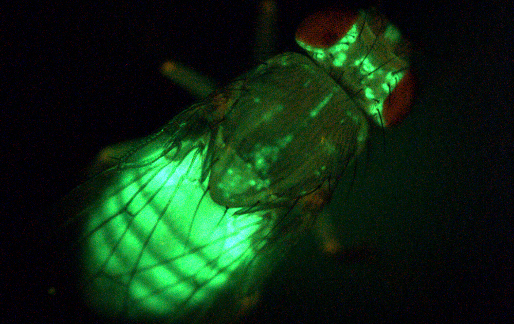 © Deutsches Krebsforschungszentrum | An Fliegen lässt sich der Energiestoffwechsel gut erforschen. Hier wird das Körperfett der Fliege durch das fluoreszierende Protein GFP ("green fluorescent protein") sichtbar gemacht.