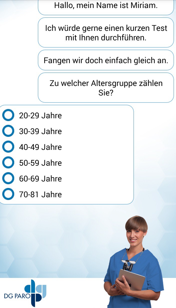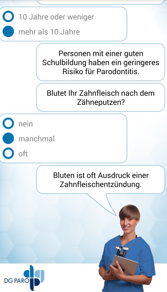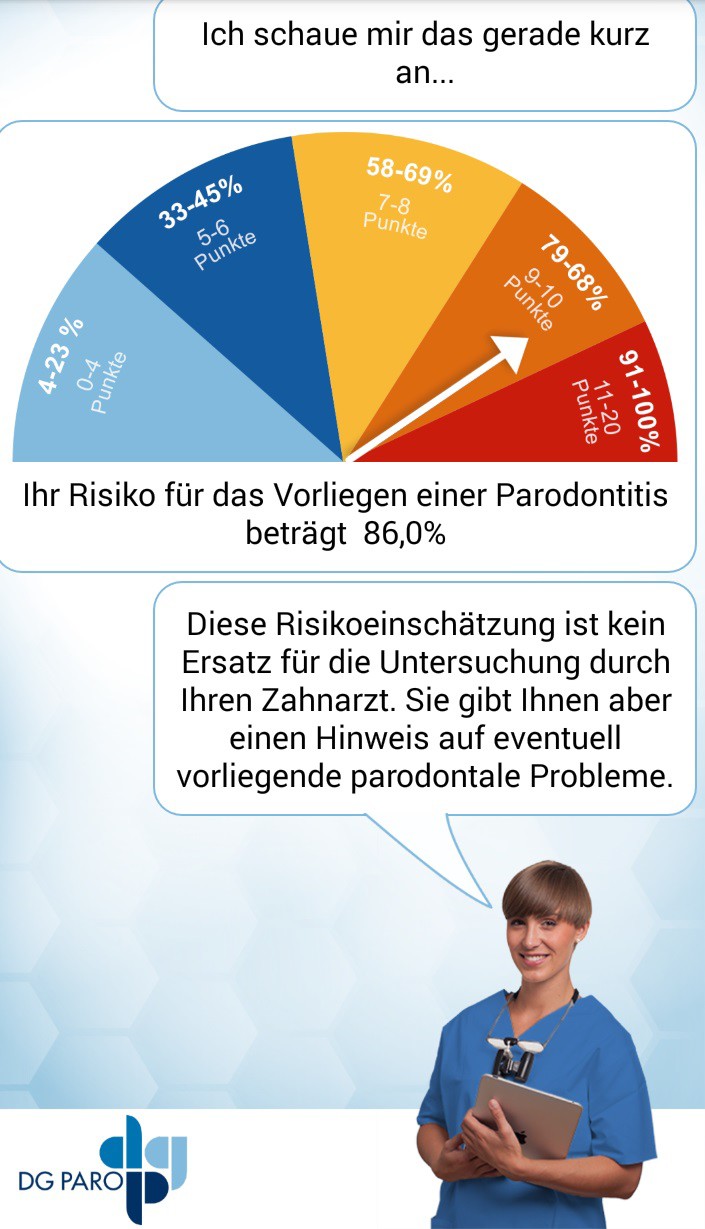 Der von der DG PARO entwickelte Selbsttest Parodontitis basiert auf dem wissenschaftlich evaluierten Risiko-Score-System. Der Selbsttest kann von jedem Erwachsenen ohne großen Aufwand durchgeführt werden – ob per App über das Smartphone oder anhand des Fragebogens in der Praxis. Dies eröffnet neue Möglichkeiten, sehr viel mehr Patienten zu erreichen, aufzuklären und zu sensibilisieren. Der im Wartezimmer ausgefüllte Fragebogen ist eine gute Basis für das Patientengespräch mit dem Diabetologen, der bei entsprechendem Ergebnis die Empfehlung aussprechen kann, den Zahnarzt zu konsultieren. So wird eine einfache Schnittstelle für die Kooperation zwischen Allgemeinarzt und Zahnarztpraxis hergestellt.