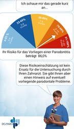 Auch in der Zahnmedizin sind verschiedene Prädiktionsmodelle wie das PRA (Periodontal Risk Assessment Tool) zur Einschätzung des Rezidiv-Risikos im Einsatz. Diese Modelle sind aber auf den klinischen Alltag beschränkt. Patienten können sie nicht selbst zu Hause nutzen. Zur Sensibilisierung und Früherkennung bei Parodontitis wurde an der Universitätsmedizin Greifswald daher ein neues Risiko-Score-System entwickelt und evaluiert, das unabhängig von klinischen Befunddaten eingesetzt werden kann. Der Risiko-Score ist ein breit einsetzbares Screening-Instrument, mit dem unkompliziert, aber verlässlich das Risiko einer Parodontitis bewertet werden kann – und zwar vom Patienten selbst. Anhand von sechs Risikofaktoren wie etwa Alter, Geschlecht oder Zahnfleischbluten werden Kategorien – zum Beispiel „weiblich/männlich“ oder „ja/nein“ – angegeben und mit Punkten bewertet. Je höher der Wert, desto höher das Parodontitis-Risiko.