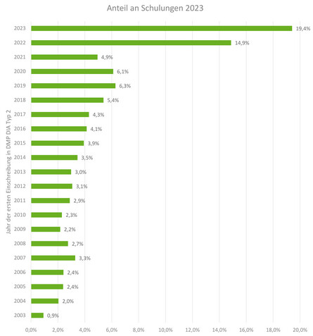 Da eine mehrjährige versichertenbezogene Analyse aus verschiedenen Gründen nicht vollständig möglich ist, wurde im nächsten Schritt lediglich die im Jahr 2023 geschulten Versicherten mit dem Jahr der Ersteinschreibung in ein DMP Diabetes Typ 2 abgeglichen. Frühere Einschreibungen, die ggf. zwischenzeitlich zu einer Ausschreibung und erneuter Ersteinschreibung des Versicherten geführt haben könnten, wurden dabei nicht differenziert.