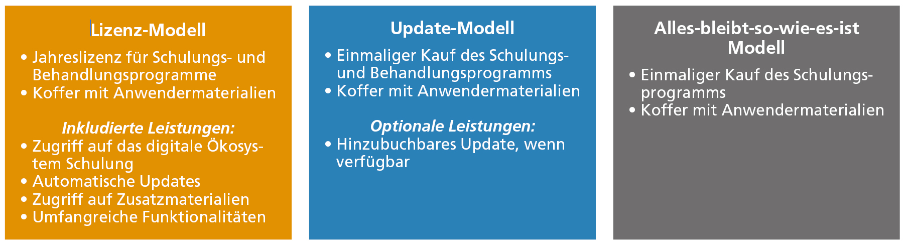 - Das „Lizenz“ Modell: Mit einer Jahreslizenz erhalten Sie vollen Zugriff auf das digitale Ökosystem Schulung mit allen Zusatzmaterialien und automatischem Zugriff auf alle Updates zu dem in der Lizenz enthaltenen Schulungs- und Behandlungsprogramm. Zu Beginn der Lizenz erhalten Sie den Schulungskoffer mit allen Anwendungsmaterialien.