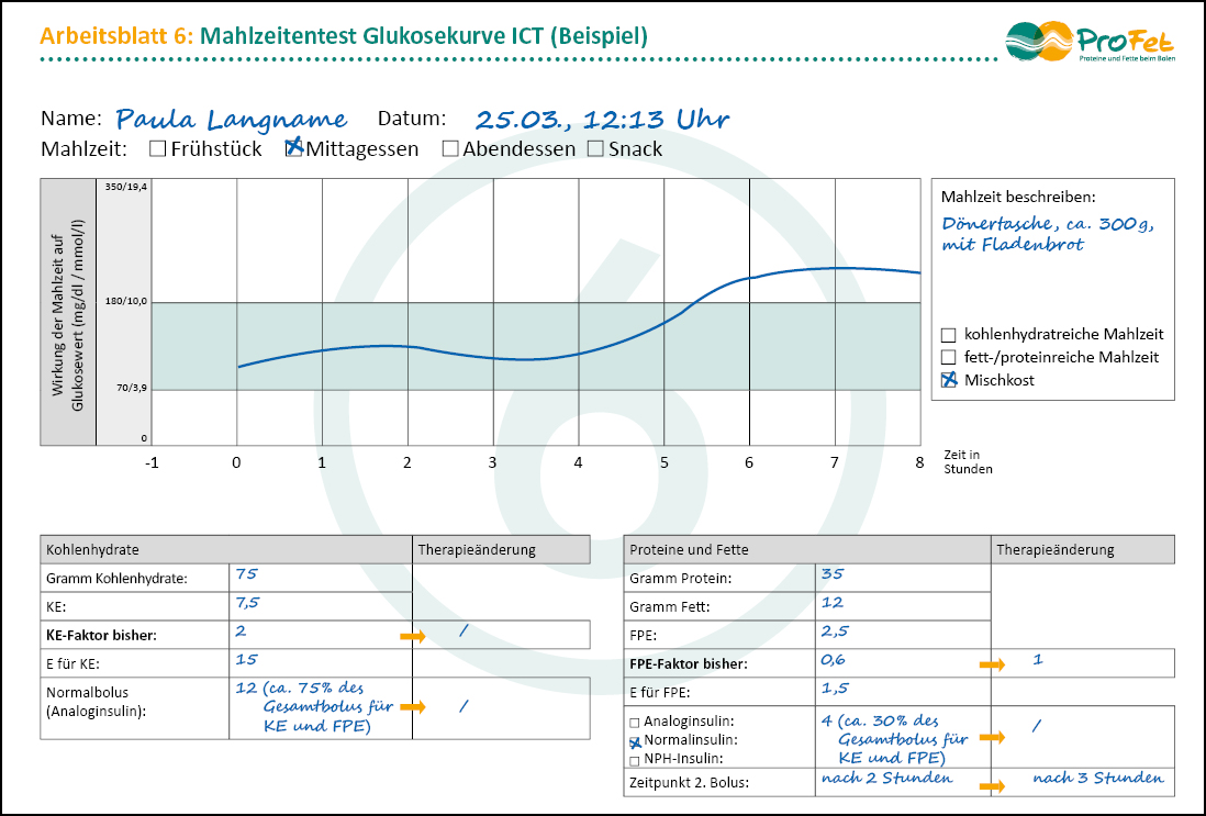 Zu Beginn der Profet-Schulung sollten daher Basalraten- sowie Mahlzeitentest mit reinen Kohlenhydratmahlzeiten erfolgen. Die ProFet-Autoren empfehlen die Beurteilung von Mahlzeiten mit unterschiedlicher Nährstoffzusammensetzung und Menge sowie die schrittweise Anpassung der KE- und FPE-Faktoren. Zur Dokumentation der Mahlzeitentest steht ein Arbeitsblatt zur Verfügung (siehe Kasten sowie Abb. 1).
