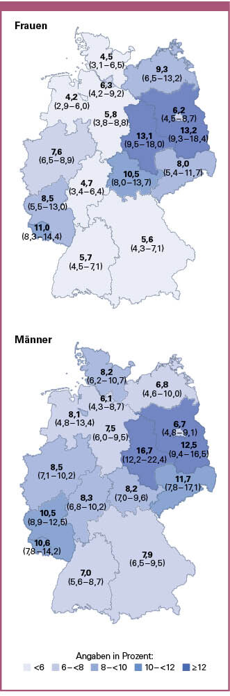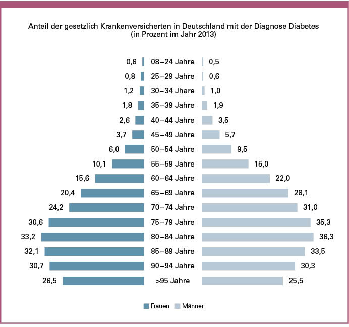 Deutschlandweit gibt es ca. 8,5 Millionen Patientinnen und Patienten mit Diabetes mellitus, dazu kommen jährlich mehr als 500 000 Neudiagnosen. Davon leiden 95 % an einem Typ-2-Diabetes. Aufgrund der Altersentwicklung der Bevölkerung ist mit einer Zunahme der Diabetes-Neudiagnosen um mehr als 50 % in den kommenden 15 Jahren zu rechnen. Die Prävalenz ist altersabhängig, ebenso sind Männer häufiger betroffen als Frauen (Abb. 1). Örtliche Unterschiede zeigen geschlechterunabhängig eine höhere Prävalenz des Diabetes mellitus in den östlichen Bundesländern (Abb. 2).