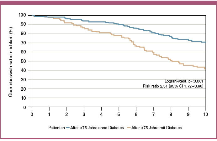 Grundsätzlich ist die pAVK mit einem erhöhten Mortalitätsrisiko vergesellschaftet, welches durch das Vorliegen eines Diabetes mellitus noch um das 2,5-fach gesteigert wird (Abb. 3). Insbesondere das Risiko für Myokardinfarkte und Schlaganfälle trägt zur erhöhten Sterblichkeit dieser Patienten bei.