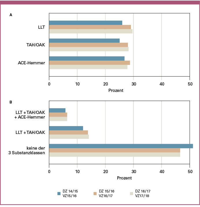 In einer retrospektiven Analyse von Verordnungsdaten aus dem Einzugsbereich der Kassenärztlichen Vereinigung Westfalen Lippe wurde deutlich, dass pAVK-Patienten eine völlig unzureichende Dauermedikation mit für die Sekundärprävention notwendigen Medikamenten (Plättchenaggregationshemmer/Antikoagulanzien, lipidmodifizierende Medikation, ACE-Hemmer) erhielten (Abb. 4). So bekamen lediglich 29 % der Patienten eine lipidmodifizierende Medikation und nur 7 % eine Kombination aus lipidstoffwechselwirksamen Medikamenten, Thrombozytenaggregationshemmern/Antikoagulanzien und ACE-Hemmern. Fast jeder zweite (46 %) erhielt keine der drei genannten Substanzklassen [Gebauer 2021].