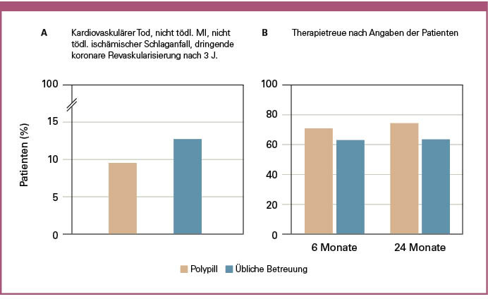 In der randomisierten SECURE-Studie wurde eine Kombinationspille mit ASS, Ramipril und Atorvastatin gegenüber der Standardtherapie bestehend aus drei einzelnen Pillen mit den jeweiligen Substanzen bei Patienten nach Myokardinfarkt getestet und hinsichtlich der Häufigkeit kardiovaskulärer Ereignisse (kardiovaskulärer Tod, Myokardinfarkt, Schlaganfall und dringliche Revaskularisation) untersucht [Castellano 2022]. Dabei hatten die Patienten mit Polypilleneinnahme signifikant weniger Ereignisse (−24 %) und ebenso eine bessere Adhärenz als die mit den Einzelkomponenten-Pillen (Abb. 5a + b).