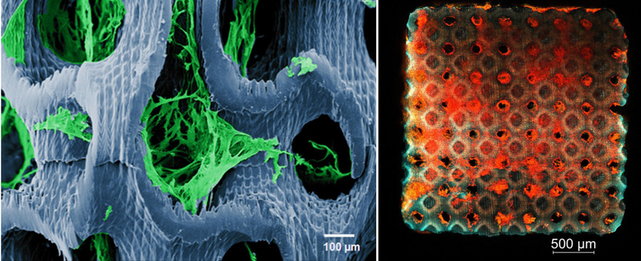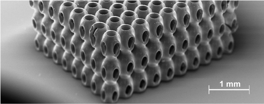 Als Beispiel können maßgeschneiderte 3D-Mikrostrukturen des iba Heiligenstadt dienen, die anhand eines Tools aus Polymeren auf Hydrogelbasis und laserbasierter Strukturierung durch Zweiphotonen-Polymerisation (2PP) Eigenschaften natürlicher Gewebematrices aufweisen und mittels Oberflächenbeschichtungen auf Polyelektroyltbasis (PEM) mit bioaktiven Funktionen entsprechend den patientenindividueller Anforderungen ausgestattet sind (siehe Abbildung 1 und 2).