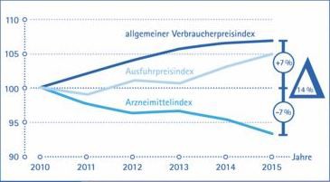 Allein in Bayern minderten sich die Erlöse der Pharmaunternehmen kumuliert um insgesamt 2,064 Milliarden Euro (2010 – 2015). Der Grund waren Preissenkungsgesetze, wie Preismoratorien, Zwangsrabatte oder niedrige AMNOG-Erstattungspreise. Gleichzeitig stiegen die Kosten für Löhne, Energie und chemische Grundstoffe. Schneider sieht das mit Sorge: „Der Inlandsmarkt verliert für die Hersteller von Arzneimitteln zunehmend an Attraktivität – besonders im Vergleich mit dem Ausland.“ Entgegen der Entwicklung in Deutschland erhöhten sich die Ausfuhrpreise für Arzneimittel seit dem Jahr 2010 um fünf Prozent. Das entspricht einem Delta von 12 Prozent im Vergleich zum Inland.