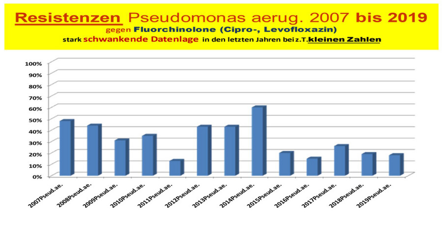 Pseudomonas aeruginosa ist in der Gesamtzahl leicht rückläufig, in den letzten Jahren sind in ca. 80 % der Fälle Fluorchinolone wieder wirksam (Abbildung 7).