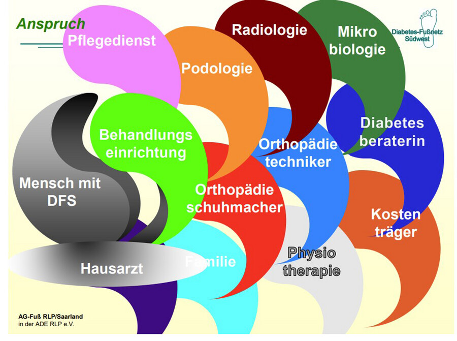 Von vorneherein war klar, dass eine Erkrankung mit einer multifaktoriellen Genese nicht durch eine monokausale Intervention anzugehen ist. Daher hatte die Arbeit der aus dem zunächst lockeren Zusammenschluss hervorgegangen AG Fuß verschiedene Ansatzpunkte: