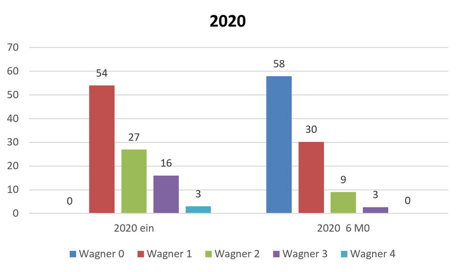 2020 war nach 6 Monaten die Zahl der Patienten mit Stadium Wagner 1 auf 56%, die der mit Stadium 2 auf 33% und die der Patienten mit Wagner Stadium 33 auf 1% gesunken (Abbildung 4, Tabelle 1).