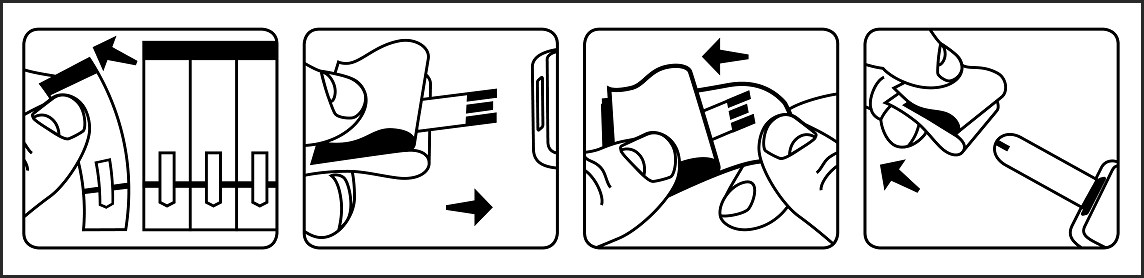 Die Sensoren, die mit allen Blutzuckermessystemen der Contour Next Generation kompatibel sind, können mittels der geöffneten Folienverpackung direkt in das Messgerät gesteckt und nach der Messung einfach wieder mithilfe der Folie herausgezogen werden (siehe folgende Abbildung). So muss der Teststreifen nicht mit den Händen berührt werden und lässt sich hygienisch entsorgen.