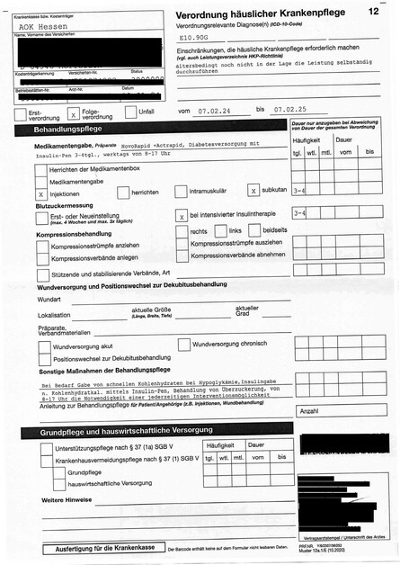 Eine solche Begleitperson bei Kindern mit Diabetes wurde bislang regelmäßig als Leistung der häuslichen Krankenpflege angesehen (sog. "Sicherungspflege" in Form der speziellen Krankenbeobachtung, § 37 Abs. 2 Satz 1 SGB V), die vom Arzt formlos oder unter Verwendung des Formularvordrucks 12 (https://www.kbv.de/html/28888.php) verordnet werden kann.
