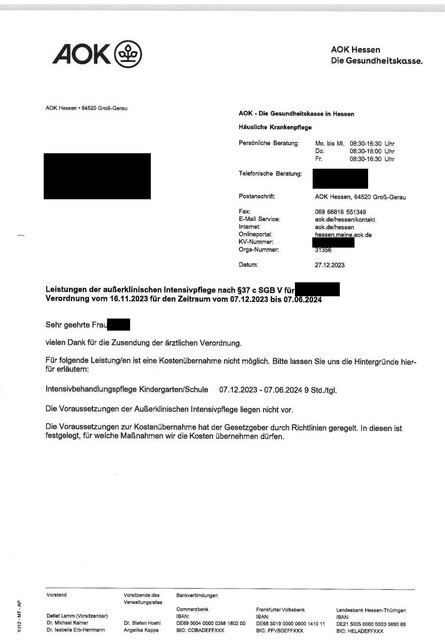Wird der Antrag von der Krankenkasse mit der Begründung abgelehnt, dass eine Verordnung von "Außerklinische Intensivpflege" unter Verwendung der Vordrucke Muster 62b und 62c erforderlich sei, dann würde ich hiergegen sofort Widerspruch einlegen. Für alle Fälle sollte der Arzt dann aber gleich die geforderte Verordnung für Außerklinische Intensivpflege ausstellen. Da es relativ lange dauern kann, bis die Krankenkasse den Widerspruch bearbeitet, könnte eine einstweilige Anordnung beim Sozialgericht beantragt werden. Es empfiehlt sich, hierzu anwaltliche Hilfe in Anspruch zu nehmen.