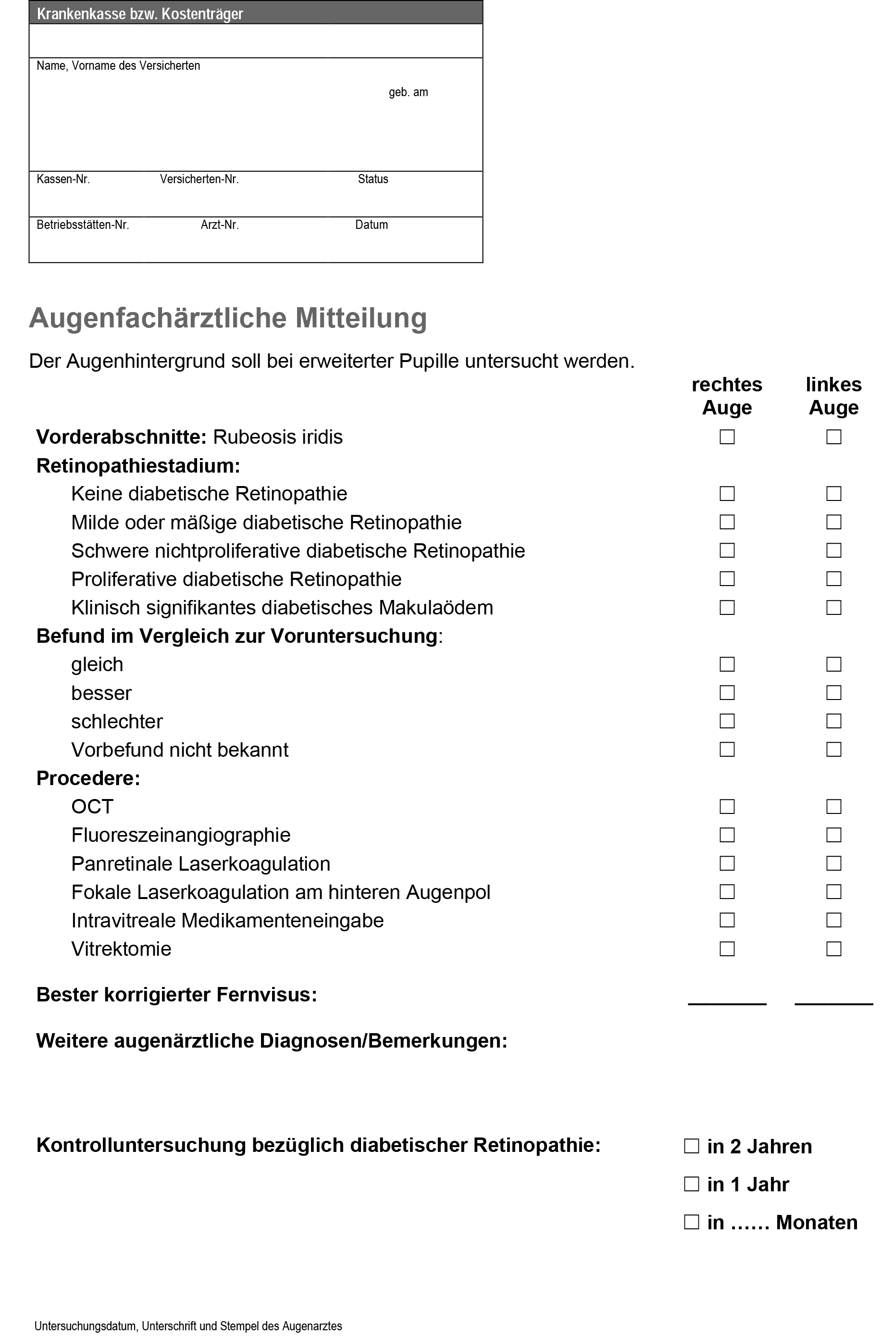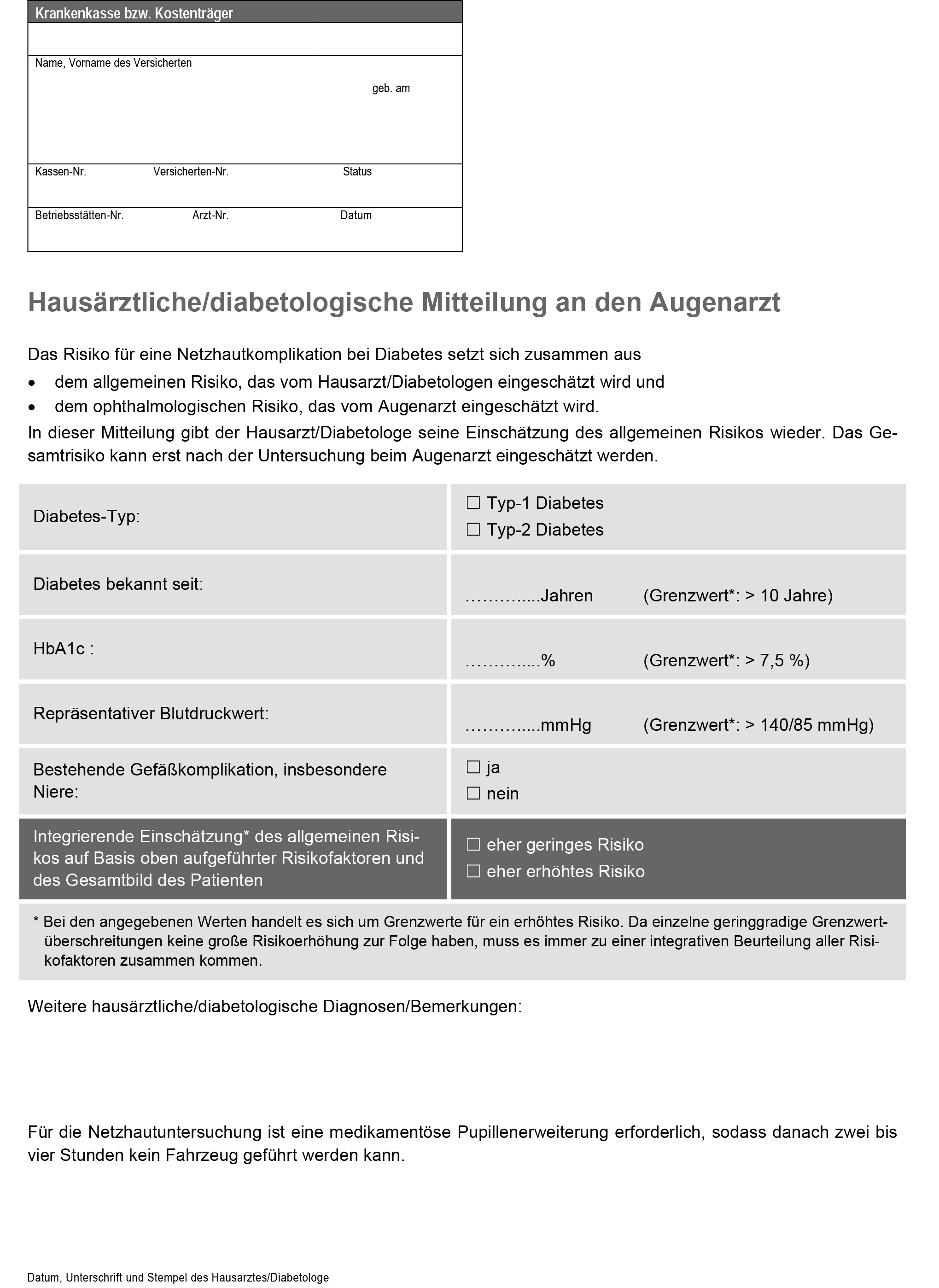 Basis der Kommunikation an dieser wichtigen Schnittstelle sind zwei Befundbögen: der Hausärztlich/diabetologische Befundbogen sowie derAugenärztliche Befundbogen. Die Überweiser verantworten die Risikostratifizierung auf internistisch-diabetologischem Gebiet und weisen die ophthalmologischen Partner auf wichtige Risikokonstellationen hin und fassen das Ergebnis der Einschätzung zu einem eher niedrigen bzw. einem eher erhöhten Risiko zusammen.