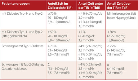 Generell ist zu beachten, dass auch mit einem AID und dessen Nutzung unter den unterschiedlichsten Alltagsbedingungen selten alle Glukosewerte dauerhaft im Zielbereich liegen werden. Auch mit einem AID liegt das Behandlungsziel in der Vermeidung akuter Komplikationen (schwere Hypoglykämien, diabetische Ketoazidosen) und diabetischer Folgeerkrankungen. Entsprechend eines Konsensus-Statements einer internationalen Expertengruppe bedeutet dies, dass Menschen mit Typ-1-Diabetes (MmT1D) einen Anteil der Zeit im Glukosezielbereich von 70-180 mg/dl (3,9-10,0 mmol/l), die sogenannte "Time in Range" von mindestens 70% haben sollen. Dabei soll der Anteil der Zeit unter 70 mg/dl (3,9 mmol/l) <4% und unter 54 mg/dl (3,0 mmol/l) < 1% sein (Tabelle 1) [1].
