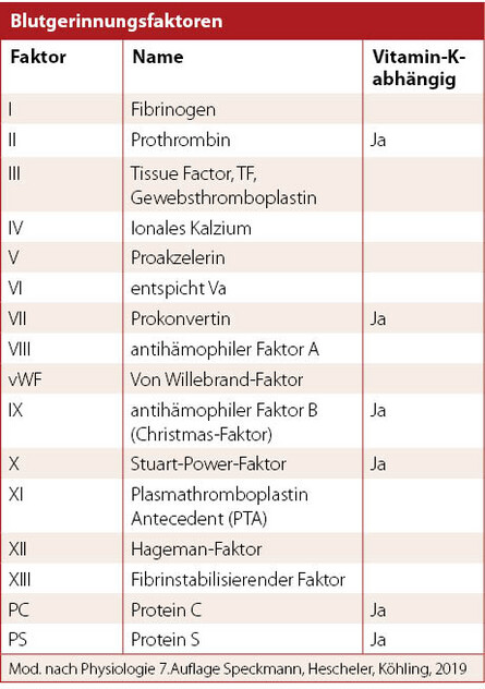 Die Gerinnungsfaktoren II, VII, IX und X, aber auch Protein C und S werden in der Leber hergestellt und sind von Vitamin K als Ko-Faktor abhängig (für die γ-Carboxylierung). Wenn diese Vitamin-K-abhängigen Faktoren nicht gebildet werden können oder in zu geringer Konzentration besteht eine erhöhte Blutungsneigung. Z.B. bei: