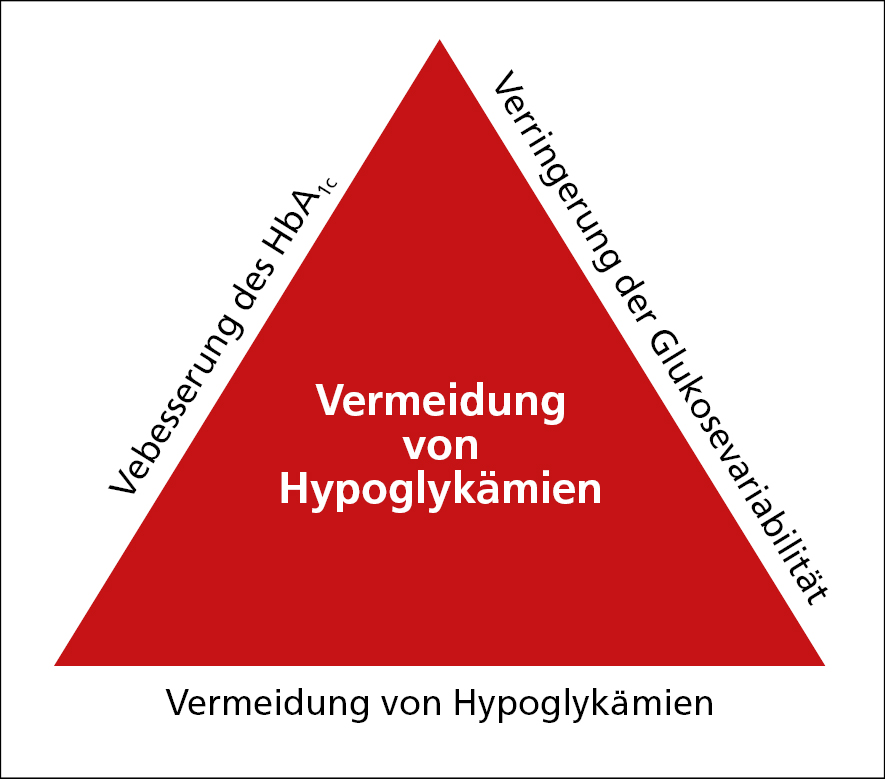 Das bewährte Konzept des "Triangle of Care" bildet die oben genannten Parameter zur Therapieoptimierung und Verbesserung der Prognose des Patienten ab: Die erweiterten Ziele des Diabetesmanagements sind demnach eine Verbesserung des HbA1c-Werts, eine Verringerung der Glukosevariabilität sowie eine Vermeidung von Hypoglykämien. Idealerweise werden alle drei Ziele erreicht. Dies ist in der täglichen Diabetestherapie jedoch nicht immer möglich. Die Nutzung von CGM-Systemen kann den Patienten bei der Erreichung dieser Ziele unterstützen.