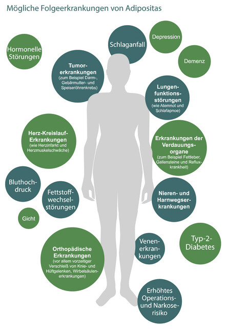 Adipositas kann zahlreiche Folge- und Begleiterkrankungen nach sich ziehen. Nahezu jedes Organsystem kann betroffen sein.
