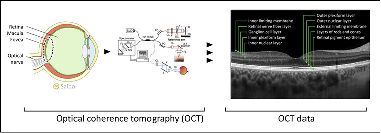 Die optische Kohärenztomographie (OCT) des Auges ist ein diagnostisches Verfahren, das ermöglicht, in kurzer Zeit und ohne direkten Kontakt mit dem Auge mikroskopisch genaue Schnittbilder der Retina anzufertigen. Analog zur Sonographie werden auf der Grundlage von Reflexionsvermögen und Streueigenschaften Querschnittsbilder erzeugt.