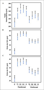 In einer Querschnittsstudie bei pädiatrischen Patienten mit T1DM und ohne Nachweis einer DR konnten wir signifikante Unterschiede für die Gesamtdicke der Retina sowie für einzelne Netzhautschichten im Vergleich zu gesunden Probanden feststellen (Abb. 4 und 5). Die OCT zeigte, dass bei den Patienten die retinale Ganglienzellschicht (GCL) und die innere plexiforme Schicht (IPL) im Bereich der Parafovea betroffen sind. Dies spricht, trotz der insgesamt noch relativ kurzen Erkrankungsdauer von 5,25 ± 4,29 Jahren für eine höhere Anfälligkeit der GCL und IPL.