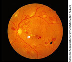 Eine Sehverschlechterung nehmen die Patienten jedoch erst wahr, wenn die Fovea centralis selbst mitbetroffen ist (Barber 2003; Kollias & Ulbig 2010). Weitere Merkmale diabetesbedingter vaskulärer Veränderungen sind die Entwicklung von Mikroaneurysmen, die Ablagerung von Exsudaten, Blutungen und schließlich Neovaskularisationen an der Papille im Sinne einer proliferativen DR (s. Abb. 1).