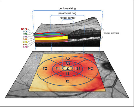Als nicht-invasive Untersuchungsmethode erlaubt die OCT schmerz- und berührungsfreie sowie detailgetreue Darstellung von intraretinalen Mikrostrukturen und ermöglicht als "optische Biopsie" frühe und kleinste Veränderungen der Retinamorphologie zu erkennen. Eine qualitative Analyse geschieht üblicherweise sektorbasiert (Abb. 3).