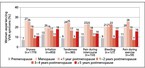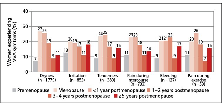 Dabei zeigte sich, dass viele der oben angegeben Beschwerden der Vulvovaginalen Atrophie bereits in der Perimenopause nachweisbar waren und dass der Beschwerdehöhepunkt innerhalb der ersten postmenopausalen Jahre lag. Aber es wurde auch evident, dass viele Frauen auch 5 Jahre nach der Menopause unter heftigen Symptomen litten (Abb. 1).