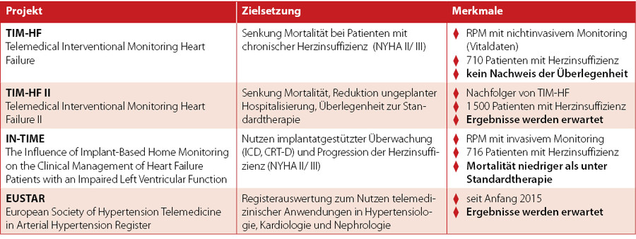 In der Kardiologie konnte der Nutzen von RPM mit implantierbaren Devices (ICD*, CRT-D**) gezeigt werden. Die Mortalität der via Telemonitoring überwachten Patienten mit Herzinsuffizienz war niedriger als unter Standardtherapie. [4] Die Ergebnisse von TIM-HF II (Telemedical Interventional Monitoring Heart Failure II) werden noch erwartet. Ziel ist es, die Überlegenheit von RPM mit nichtinvasivem Monitoring hinsichtlich ungeplanter Hospitalisierung, Tod und Lebensqualität im Vergleich zur Standardtherapie zu belegen.