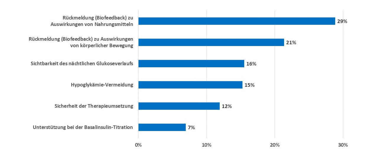 Befragt nach neuen Indikationen, halten aktuell 25% der Diabetolog:innen CGM zur Prävention des Typ-2-Diabetes für bedeutsam (in 5 Jahren: 37%), 13% CGM zur Therapie der Adipositas. (in 5 Jahren 23%). Für die Indikation CGM bei einer BOT-Therapie, für die es inzwischen erste Verträge mit einzelnen Krankenkassen gibt, halten die Diabetolog:innen vor allem das Biofeedback hinsichtlich der Ernährung und Bewegung und die Sichtbarkeit des Glukoseverlaufs für hilfreich.