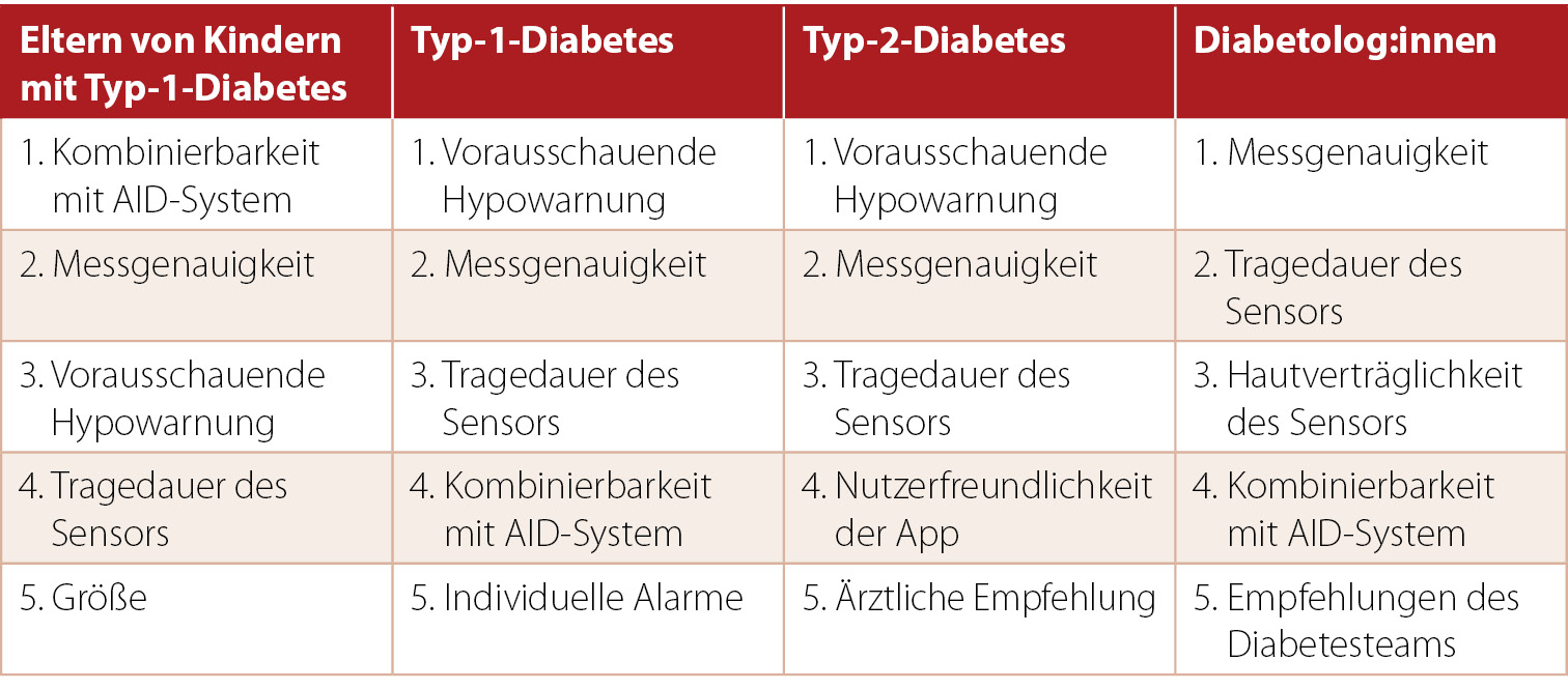 Menschen mit Diabetes treffen die Entscheidung, welches CGM-System für sie am besten geeignet ist. Daher wollten wir von ihnen und Diabetolog:innen wissen, was die wichtigsten Gründe für Menschen mit Diabetes bei der Wahl eines bestimmten CGM-Systems sind. Obwohl die wichtigsten Themen - Messgenauigkeit, Kombinierbarkeit mit CGM, Tragedauer des Sensors – bei allen 4 Gruppen unter den Top 5 zu finden sind, gibt es auch deutliche Unterschiede. Ärzte unterschätzen die Funktion der prädiktiven Hypowarnung, die sowohl für Erwachsene mit Typ-1- als auch mit Typ-2-Diabetes sehr wichtig ist. Für letztere ist auch die Benutzerfreundlichkeit der App wichtig. Menschen mit Typ-1-Diabetes schätzen zudem die Möglichkeit, die Alarme individuell einstellen zu können.