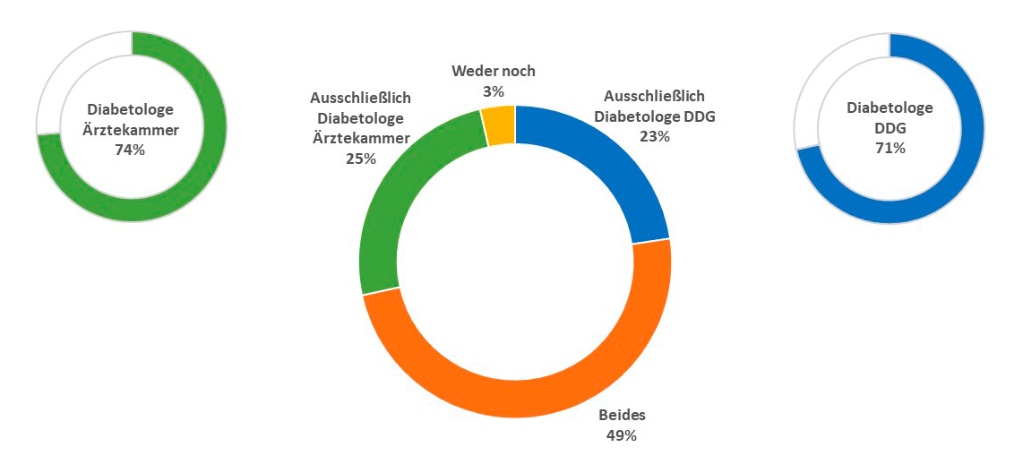 Fast alle Befragten verfügen über eine diabetologische Zusatzweiterbildung. Obwohl die Weiterbildung "Diabetolog:in Ärztekammer" rechtlich einen höheren Stellenwert hat als die Weiterbildung "Diabetolog:in DDG", erfreut sich diese qualitativ hochwertige Weiterbildung weiterhin ungebrochener Beliebtheit: 71% der Befragten haben diese Weiterbildung absolviert (siehe Abbildung 2).