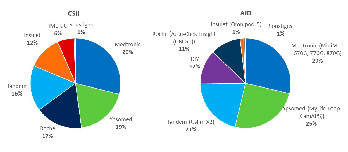 Während auf dem CGM-Markt vor allem die beiden Hersteller Abbott und Dexcom dominieren, ist bei den Smart Pens die Firma Novo Nordisk am beliebtesten. Sowohl Insulinpumpen als auch AID-Systeme der Firma Medtronic werden häufig genutzt. Allerdings gibt es viele verschiedene Anbieter von CGM- und AID-Systemen mit ebenfalls beachtlichen Marktanteilen, die teilweise auch erst 2023 auf den Markt gekommen sind, so dass diese Befragung naturgemäß den Stand der Befragung (2023) abbildet (siehe Abbildung 4).