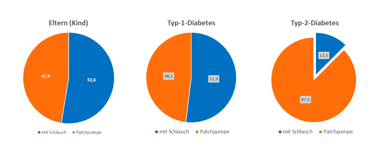 Während Eltern und Menschen mit Typ-1-Diabetes sich gleichermaßen vorstellen können, eine Insulinpumpe mit oder ohne einen Schlauch (Patchpumpe) zu wählen, präferieren Menschen mit Typ-2-Diabetes eindeutig schlauchlose Pumpen (siehe Abbildung 3).