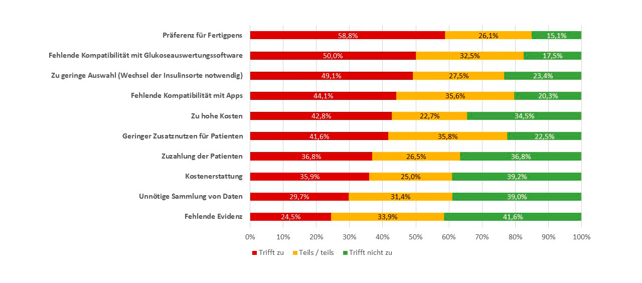 Aber auch psychologische Faktoren wie das Gefühl der Abhängigkeit von der Technik (44%/43%), ein beeinträchtigtes Körpergefühl (36%/40%) sowie ein mangelnder Tragekomfort (38%/45%) spielen eine Rolle, warum eine Insulintherapie nicht eingesetzt wird.